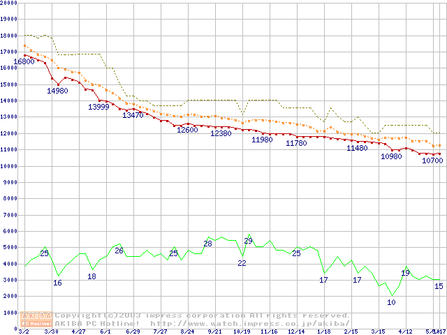 Travelstar 40GN (9.5mm,4200rpm,UltraATA/100,2MB,FDB,20GB/Platter)の最安値推移