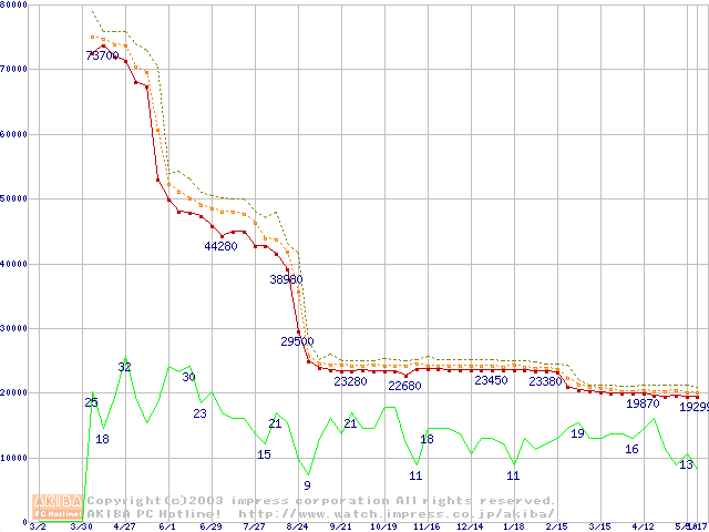 Socket 478 (micro-PGA,FSB 400MHz,L2 512KB,Northwood)の最安値推移
