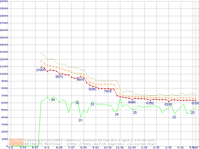 Socket 478 (micro-PGA,FSB 400MHz,L2 128KB,Willamette)の最安値推移