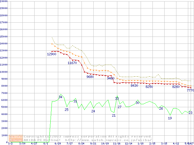 Socket 478 (micro-PGA,FSB 400MHz,L2 128KB,Willamette)の最安値推移