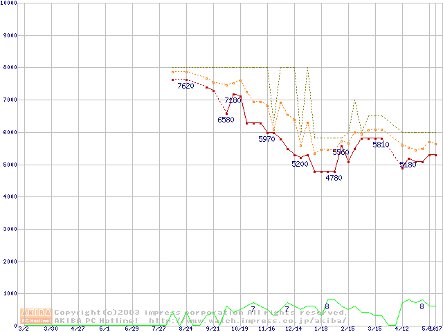 Socket 370 (FC-PGA,FSB 100MHz,L2 128KB,Coppermine)の最安値推移