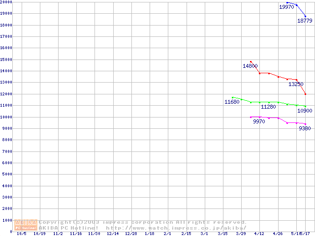 | [↑前グラフ]: | MKシリーズ (9.5mm,4200rpm,2MB,FDB,20GB/Platter)の最安値推移 |