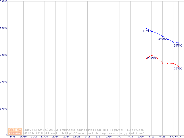 | [↑前グラフ]: | Travelstar 40GNX (9.5mm,5400rpm,UltraATA/100,8MB,FDB,20GB/Platter)の最安値推移 |