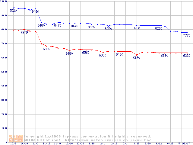 | [↓次グラフ]: | Socket 370 (FC-PGA2,FSB 133MHz,L2 512KB,Tualatin)の最安値推移 |