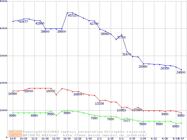| [↓次グラフ]: | PC2100(DDR266) DDR SDRAM DIMM(CL 2.0) ECC対応 Registeredタイプの最安値推移 |