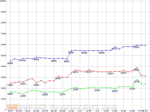 | [↓次グラフ]: | PC133 SDRAM DIMM CasLatency=2の最安値推移 |