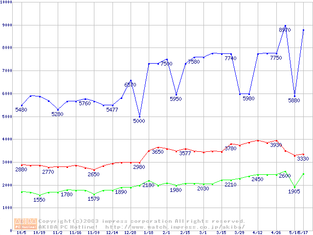 | [↓次グラフ]: | PC100 SDRAM DIMM CasLatency=2 ECC対応の最安値推移 |