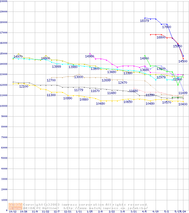 2.5インチHDD主要製品(最安値1万5千円~2万円未満)の最安値推移