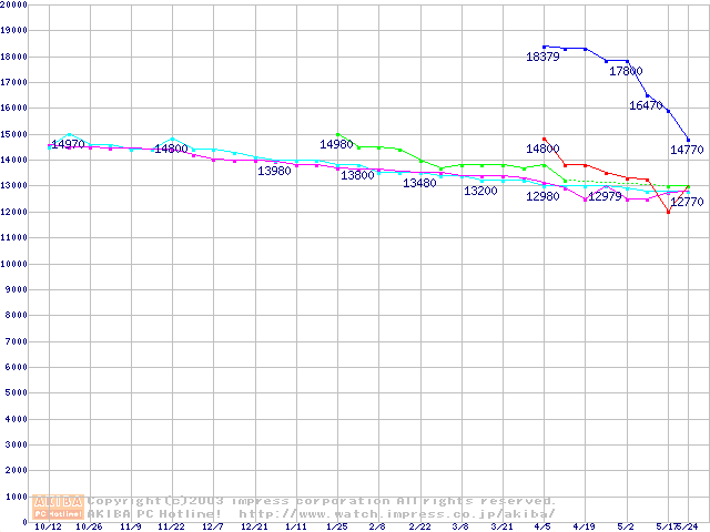 | [↑前グラフ]: | 2.5インチHDD 30GB~40GB未満(9.5mm厚)の最安値推移 |
