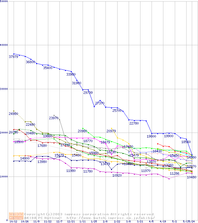 HDD主要製品(最安値1万5千円~2万円未満)の最安値推移