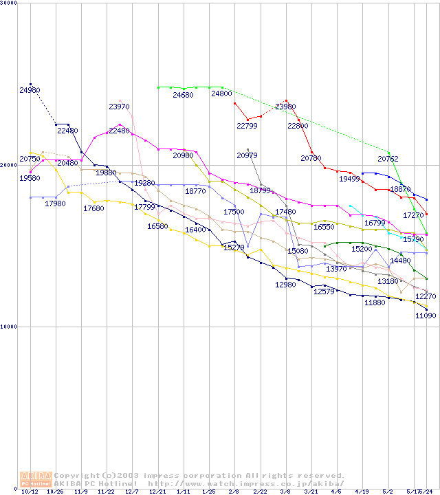 HDD 100~160GB未満(7200rpmクラス)の最安値推移