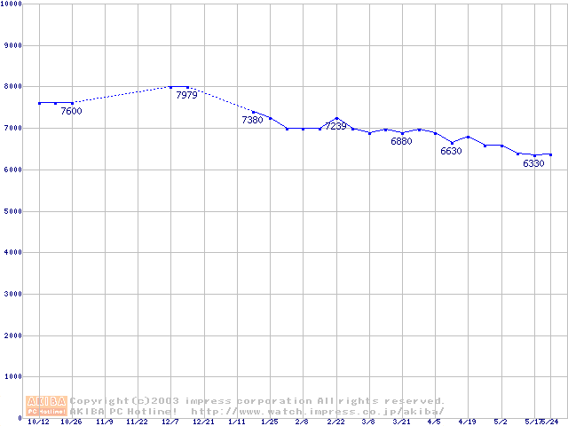 | [↑前グラフ]: | HDD 20GB~30GB未満(5400rpmクラス)の最安値推移 |