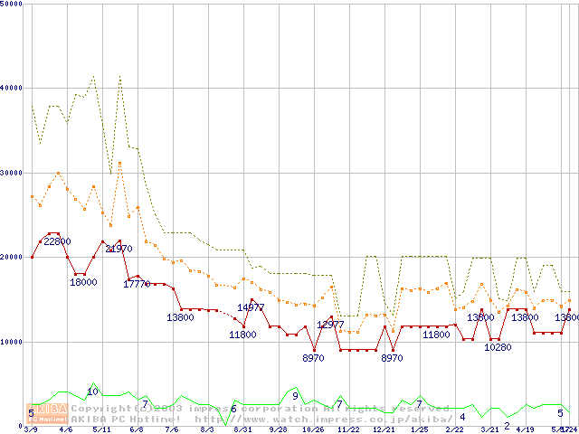 PC133 SDRAM DIMM CasLatency=3 ECC対応 Registeredタイプの最安値推移