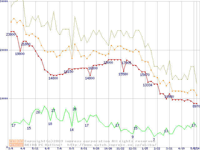 PC2100(DDR266) DDR SDRAM DIMM ECC対応 Registeredタイプの最安値推移