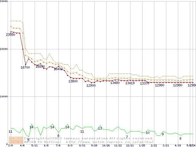 Socket 370 (FC-PGA2,FSB 133MHz,L2 256KB,Tualatin)の最安値推移