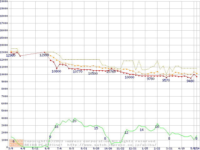 MKシリーズ (9.5mm,4200rpm,2MB,FDB,20GB/Platter)の最安値推移