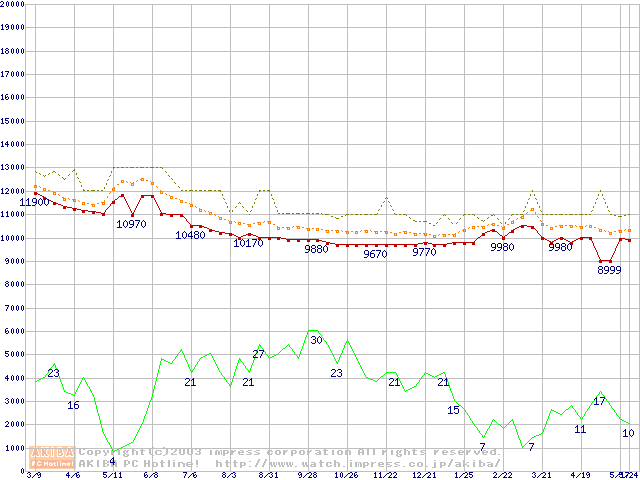 Travelstar 40GN (9.5mm,4200rpm,UltraATA/100,2MB,FDB,20GB/Platter)の最安値推移