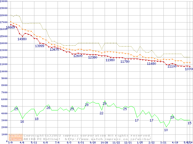 Travelstar 40GN (9.5mm,4200rpm,UltraATA/100,2MB,FDB,20GB/Platter)の最安値推移