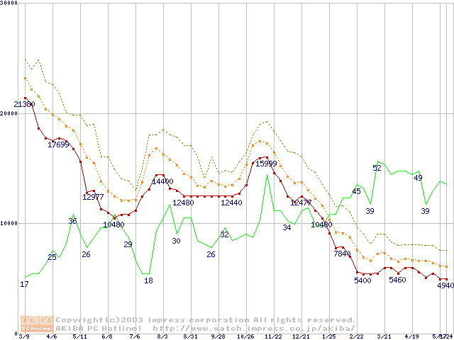 PC2700(DDR333) DDR SDRAM DIMMの最安値推移