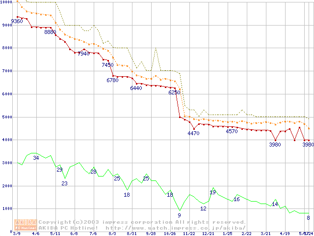 Socket 370 (FC-PGA2,FSB 100MHz,L2 256KB,Tualatin)の最安値推移