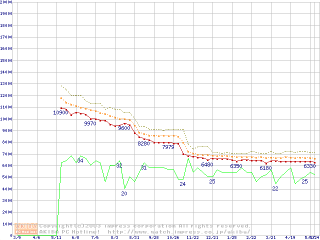 Socket 478 (micro-PGA,FSB 400MHz,L2 128KB,Willamette)の最安値推移