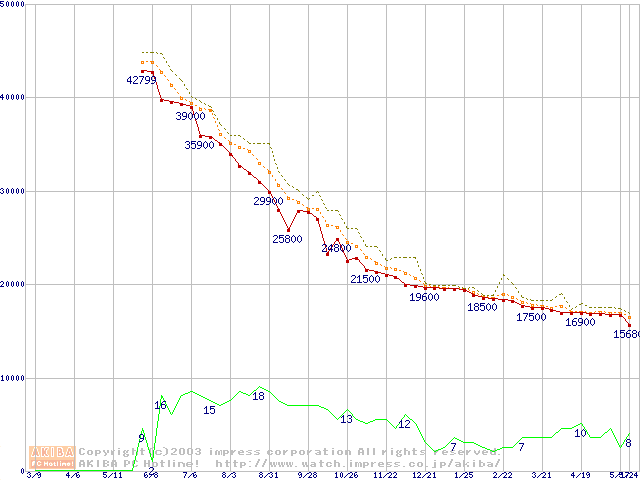 MKシリーズ (9.5mm,5400rpm,16MB,FDB,20GB/Platter)の最安値推移