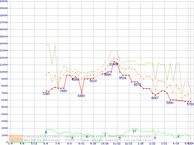 PC2100(DDR266) DDR SDRAM DIMM(CL 2.0) ECC対応 Registeredタイプの最安値推移