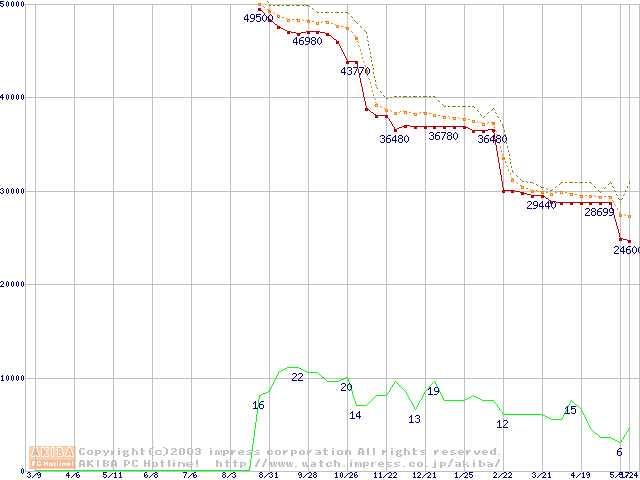 Socket 478 (micro-PGA,FSB 400MHz,L2 512KB,Northwood)の最安値推移