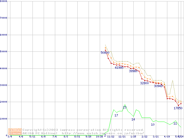 Socket A (OPGA,FSB 333MHz,L2 256KB,Thoroughbred)の最安値推移