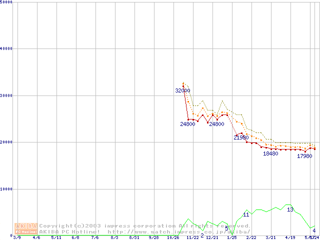 MHSシリーズ (9.5mm,4200rpm,UltraATA/100,2MB,FDB,30GB/Platter,FDB)の最安値推移