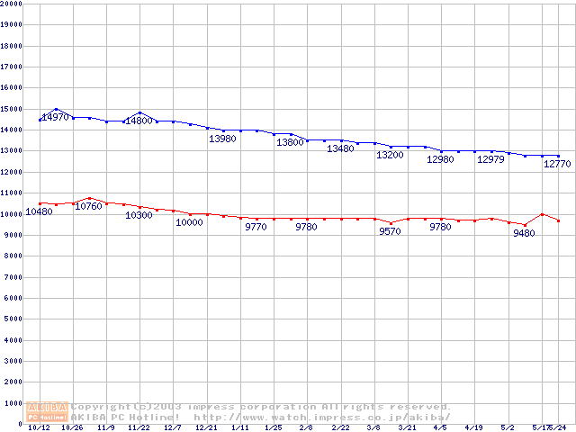 | [↑前グラフ]: | MKシリーズ (9.5mm,4200rpm,2MB,FDB,30GB/Platter)の最安値推移 |