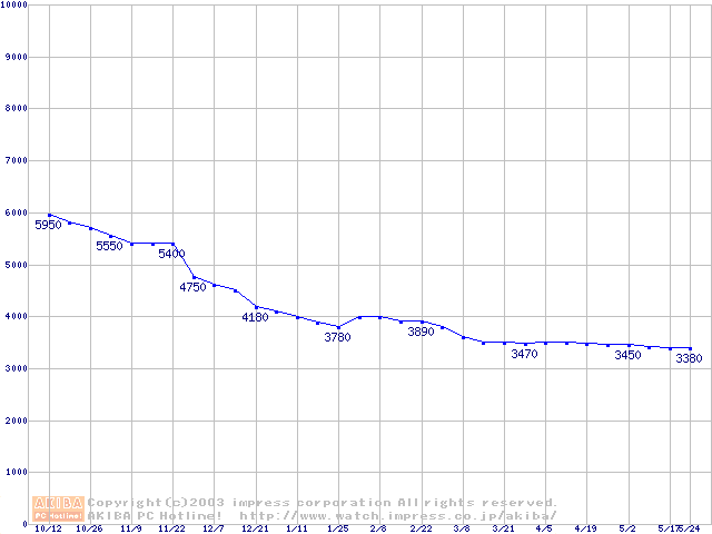 [↓次グラフ]: | Socket A (PGA,FSB 200MHz,L2 64KB,Morgan)の最安値推移 |