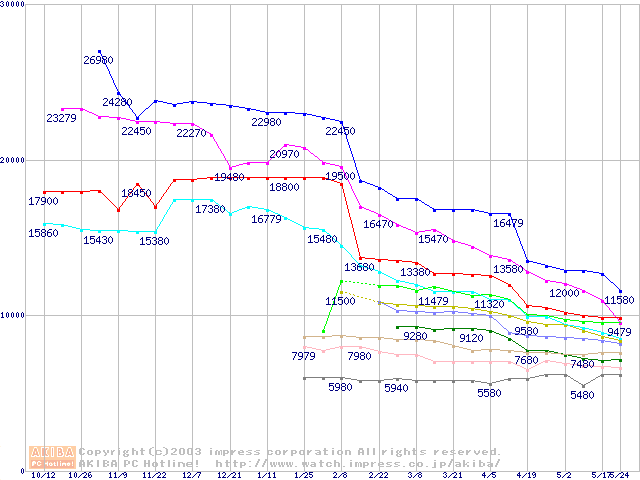Socket A (OPGA,FSB 333MHz,L2 256KB,Thoroughbred)の最安値推移