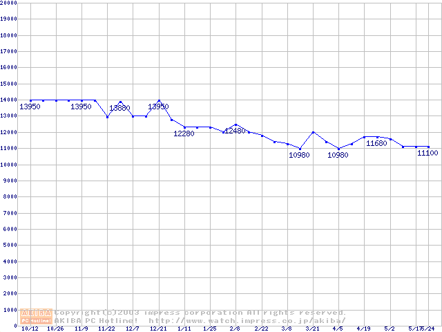 | [↑前グラフ]: | Socket 370 (FC-PGA2,FSB 133MHz,L2 256KB,Tualatin)の最安値推移 |