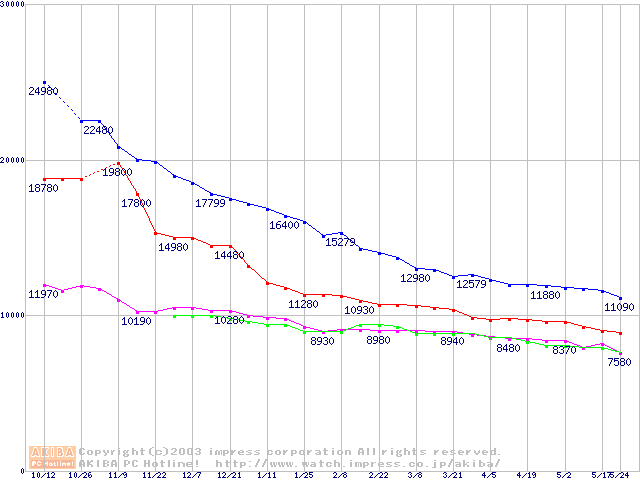 | [↑前グラフ]: | Deskstar 180GXP (7200rpm,8MB,UltraATA/100,FDB)の最安値推移 |