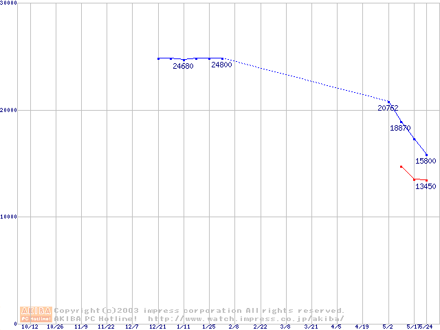 | [↑前グラフ]: | Deskstar 120GXP (7200rpm,2MB,UltraATA/100,BB)の最安値推移 |