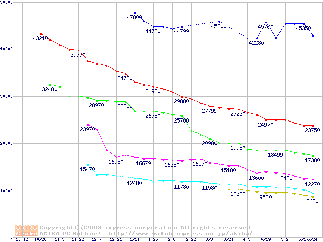 | [↑前グラフ]: | DiamondMax Plus 9 (7200rpm,8MB,SerialATA/150,FDB)の最安値推移 |