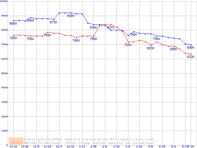 | [↓次グラフ]: | MaXLine II (5400rpm,UltraATA/133,2MB,80GB/Platter,BB)の最安値推移 |