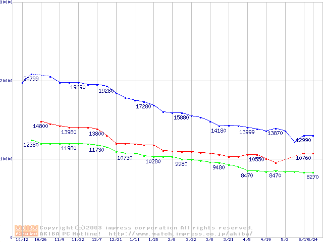 | [↑前グラフ]: | Barracuda ATA V (7200rpm,UltraATA/100,8MB,60GB/Platter,FDB)の最安値推移 |
