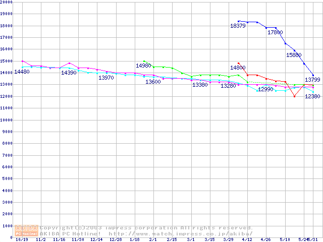 | [↑前グラフ]: | 2.5インチHDD 30GB~40GB未満(9.5mm厚)の最安値推移 |