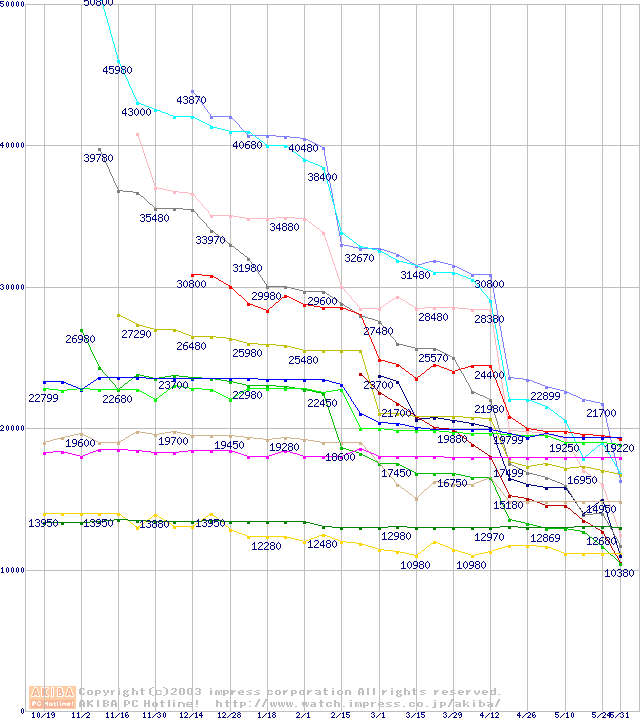 CPU主要製品(最安値2万円~3万円未満)の最安値推移