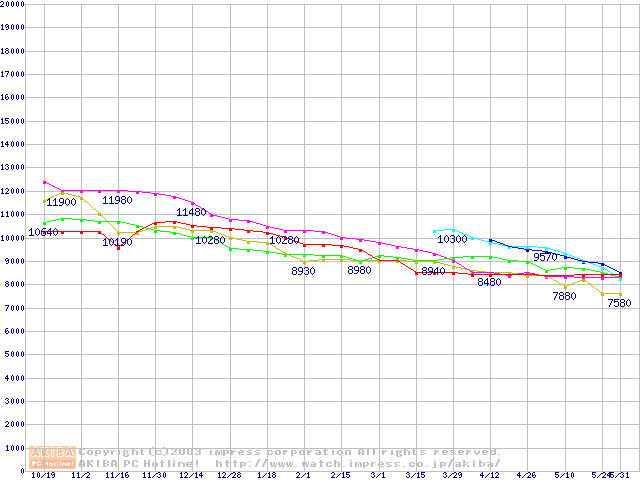 | [↓次グラフ]: | HDD 80GB~100GB未満(7200rpmクラス)の最安値推移 |