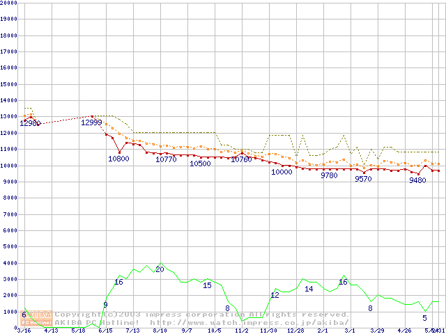 MKシリーズ (9.5mm,4200rpm,2MB,FDB,20GB/Platter)の最安値推移