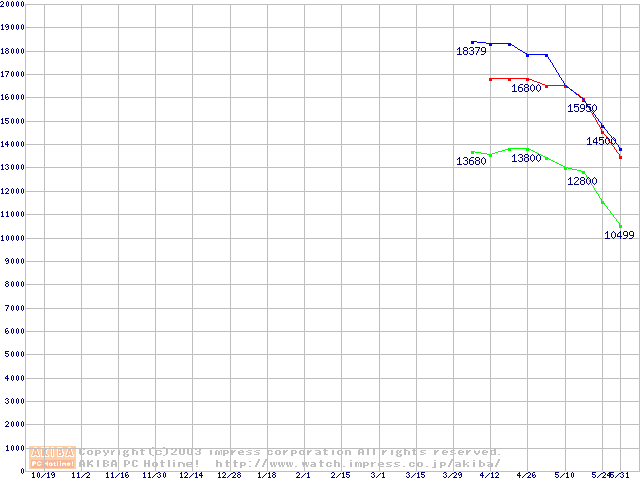 | [↑前グラフ]: | Travelstar 80GN (9.5mm,4200rpm,UltraATA/100,8MB,FDB,40GB/Platter)の最安値推移 |