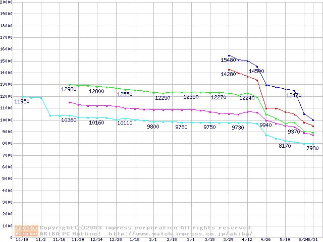 | [↓次グラフ]: | Socket 478 (micro-PGA,FSB 400MHz,L2 128KB,Willamette)の最安値推移 |