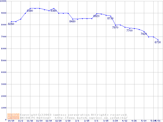 | [↑前グラフ]: | Deskstar 180GXP (7200rpm,2MB,UltraATA/100,FDB)の最安値推移 |