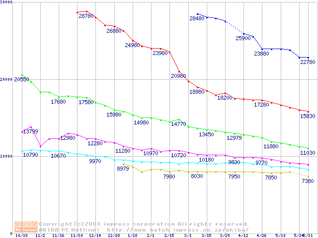 | [↑前グラフ]: | DiamondMax Plus 9 (7200rpm,8MB,UltraATA/133,FDB)の最安値推移 |