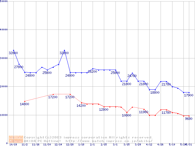 | [↑前グラフ]: | PC3200(DDR400) DDR SDRAM DIMM ECC対応の最安値推移 |