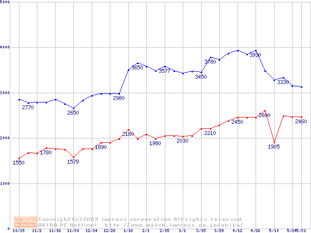 | [↓次グラフ]: | PC100 SDRAM DIMM CasLatency=2 ECC対応の最安値推移 |