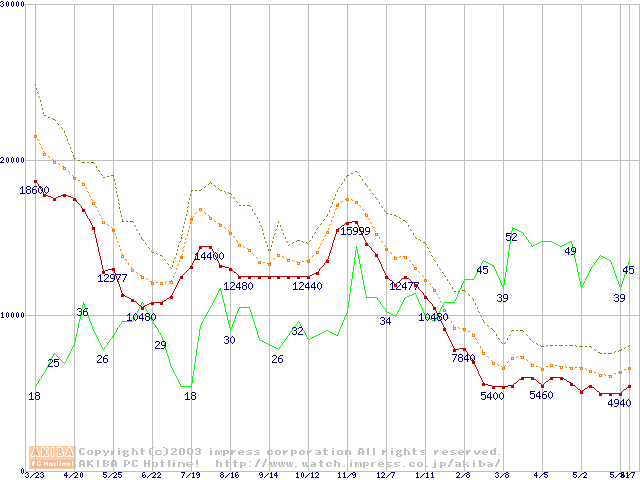 PC2700(DDR333) DDR SDRAM DIMMの最安値推移